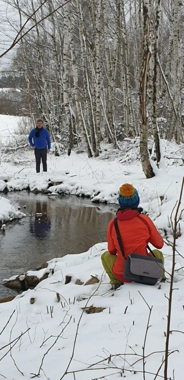 Bára je v osmnácti letech profík. Bylo jasné, že přesně ví, co chce, kde to chce a jak to chce fotit. Košile, které jsem přes hodinu žehlil, zavrhla, že vezmeme svetry a půjdeme ven. Napadl totiž sníh. A přestože byl první jarní den, měl jsem v kotníkových botách mokro asi tak po deseti metrech vycházky pospíšilovic zahradou. Pražák v Jizerkách. První focení se konalo na náhorní rovince asi tak na dvacetimetrovou vzdálenost. Dcera i matka mě upravovaly, táta držel přebytečné části garderoby a já jsem si začínal připadat jako idiot. Jako na fotce z Novy. "Uvolni se, usměj se, nebuď tak napjatej". Navíc mi do očí svítilo slunce a neviděl jsem vůbec nic. Ale to nejlepší bylo teprve před námi. Aktivní Bára to v Jizerkách zná a tak mě neomylně vedla do údolí k potoku. Přesně věděla, kam chce dojít, bohužel to bylo na ostrůvku a já jsem měl strach, že sjedu do vody. V horším případě po zadku. Chodil jsem od stromu ke stromu a stavěl se tak i onak. "Kdybys mohl jít k té vodě, ne tam, na druhou stranu", opisoval jsem ve sněhu osmičky a už mě to tolik nebavilo. Na práci modela prostě nemám trpělivost a naštěstí ani postavu . Nejhůř bylo, když mi Jana ukazovala, jak si mám dřepnout k vodě. To kdybych udělal, tak už v životě nevstanu. Ale vstal jsem. A došel domů. A bylo mi s nimi se všemi moc fajn. Jako bychom se viděly naposledy před měsícem.